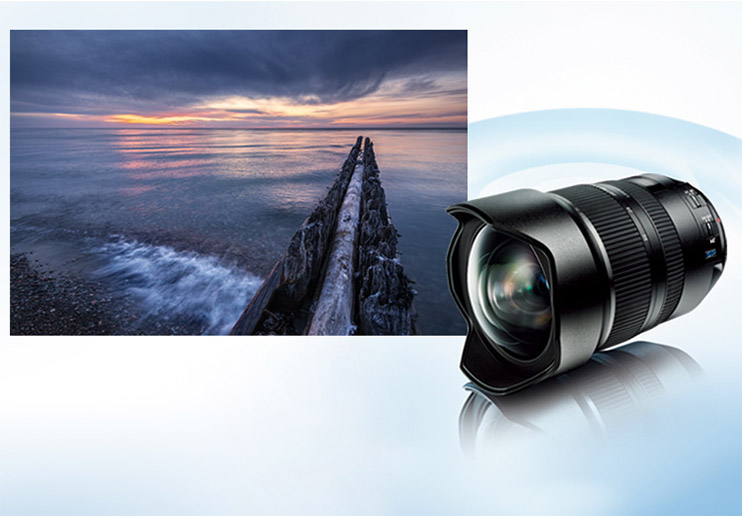 采用最新的光学设计,对超广角镜头常见的桶形畸变和放大色差等进行高度补正。凹形的LD镜片的使用能有效补正放大色差,获得清晰锐利影像,使广角端的高画质表现成为可能。