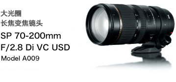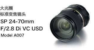 A007搭载了腾龙光学防抖系统和能实现宁静快速对焦的USD超声波马达,是覆盖广角24mm到70mm的高性能高画质大光圈标准变焦镜头。