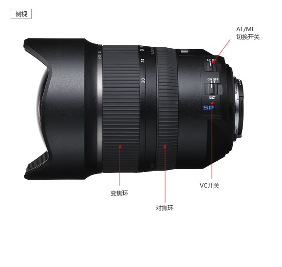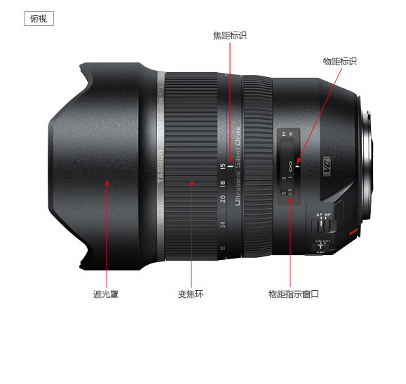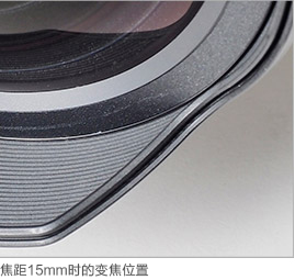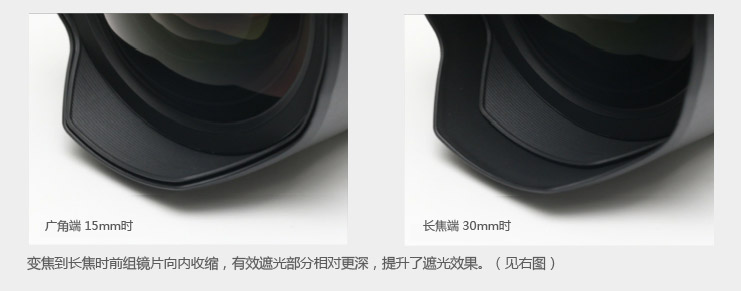 采用了特殊的光学构造,当从15mm变焦到30mm时前组镜片做倒退运动,即使在30mm端,镜头遮光罩也可有效遮光。