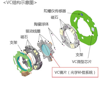 采用3组驱动线圈,通过3个陶瓷球以电磁驱动方式控制补偿镜片(VC镜片),实现极少摩擦的平滑运动。并且,A012搭载的VC机构组件特别针对F2.8大光圈超广角镜头做了最优化设计,尽可能使VC组件小型化,即使搭载防抖,F/2.8大光圈超广角镜头的体积也不会变得过于庞大。 | ![]() |