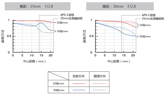 MTF曲线图中的10线/mm(低周波)的曲线越接近1说明镜头的再现性、通透性就越好。而30线/mm(高周波)曲线越接近于1,则表示镜头的解像性越敏锐。随着画面的放射方向(实线)和圆周方向(虚线)的走向,弧线弯曲也会出现差别。