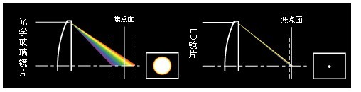 色散使影像质量锐度降低。因此,腾龙采用低色散低折射率的玻璃原材料,大大降低了长焦端处容易产生的轴向色散。 ■光学玻璃镜片与LD镜片的色散差异(模型图) |