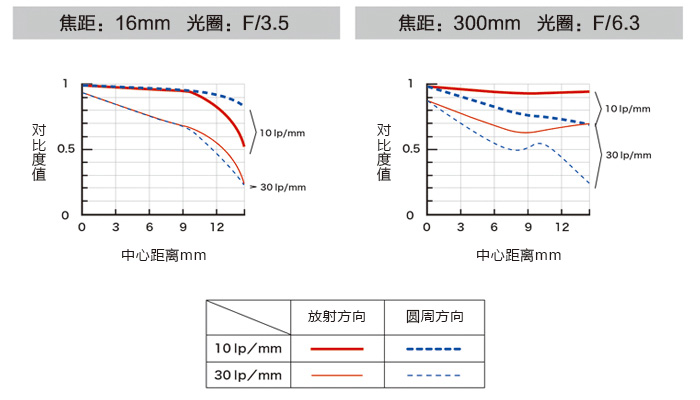 随着画面的放射方向(实线)和圆周方向(虚线)的走向,弧线弯曲也会出现差别。而为了获得解像敏锐、使画面整体效果出色的优越性能,取得各曲线之间的平衡至关重要。