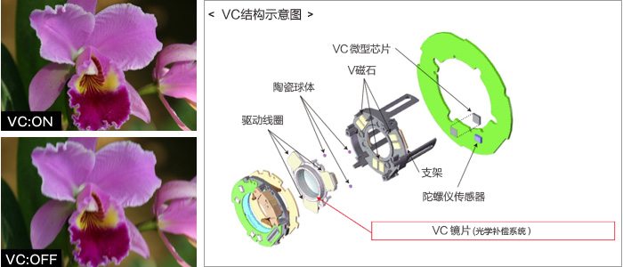 腾龙独有的VC (Vibration Compensation)防抖技术,采用3组驱动线圈,通过3个陶瓷球以电磁驱动方式控制补偿镜片(VC镜片),由于VC镜片仅与陶瓷球接触,摩擦更小更平稳。即使是在低照明环境下或是远距离拍摄,取景器画面仍能保持稳定性和出色的追踪性。 |