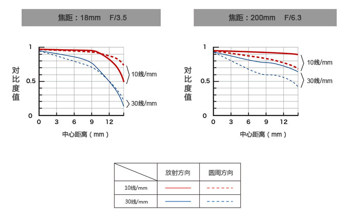 MTF曲线图中的10线/mm(低周波)的曲线越接近1说明镜头的再现性、通透性就越好。而30线/mm(高周波)曲线越接近于1,则表示镜头的分辨率越敏锐。随着画面的放射方向(实线)和圆周方向(虚线)的走向,曲线也会出现差别。
