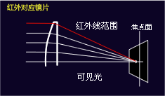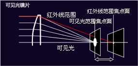 由于波长不同光线散射不同,所以可见光与近红外光的焦点面不同。该焦点面的不同是造成画面模糊的原因。 | 腾龙红外对应镜片在可见光与近红外光情况下,几乎没有改变两者的焦点面,在焦点位置固定下,昼夜都能获得清晰的影像。 |